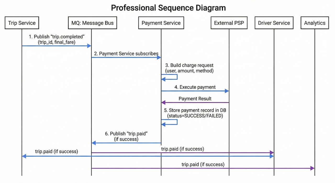 - Payment Service listens for that event, looks up the rider’s payment method, and makes a call to an external payment provider (PSP).