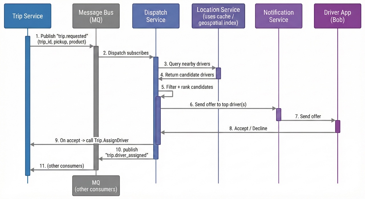 - If Bob accepts, Dispatch calls a Trip Service API to assign the driver and updates the trip status; Trip Service then emits trip.driver_assigned for others to react.
