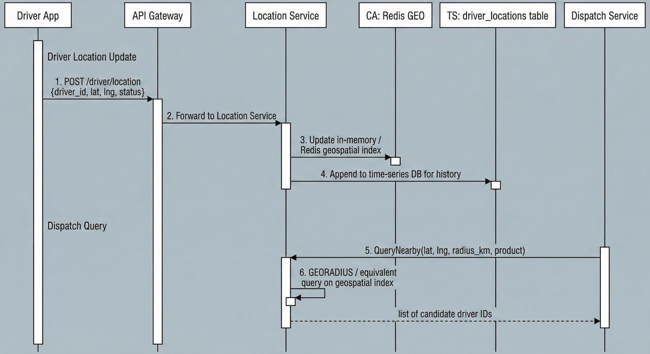 - Location Service updates a geospatial index (often Redis GEO, geohash, or a similar structure) so queries like “drivers near this point” are fast.